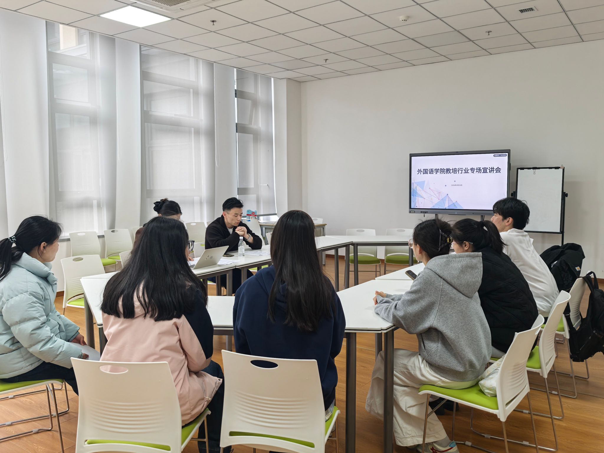 3月23日下午,外国语学院在崇文楼北109教室举办教育培训行业专场宣讲会。本次宣讲会特邀南京竹枝园托管服务有限公司张偶然到场,为有意向从事教培行业的2026届毕业生答疑解惑。学院党总支书记李星、毕业班辅导员杨婷及有意向就业的2026届毕业生共同参会。